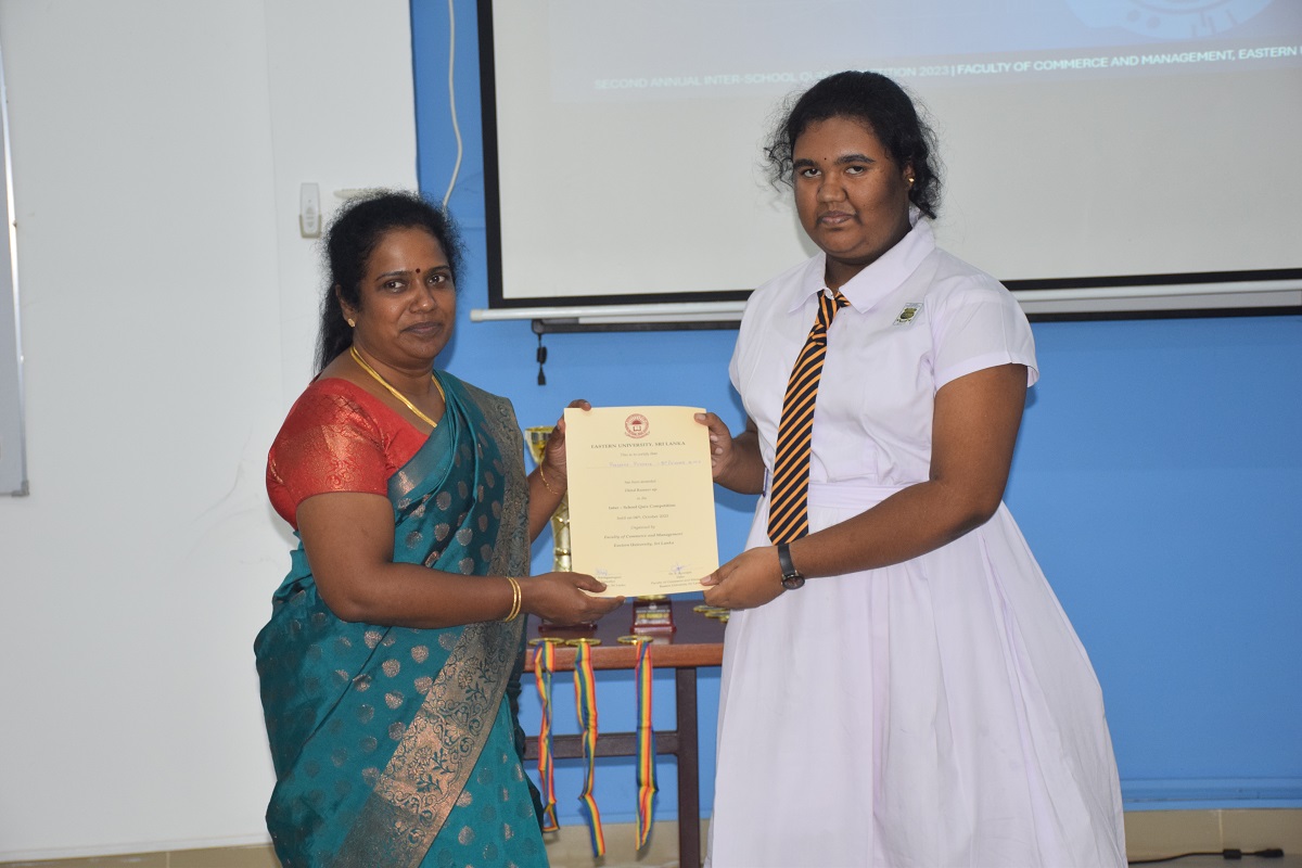 The event was coordinated by Dr. (Mrs). Jeyapraba Suresh, the Head of the Department of Economics at the Faculty of Commerce and Management, Eastern University, also served as the Coordinator for the Inter-School Quiz Competition 2023.